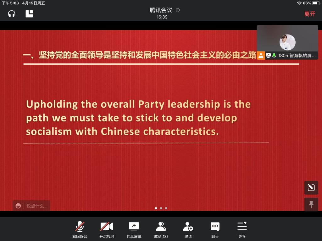 4月15日下午,15vip太阳集团官网本科生第二党支部在腾讯会议开展双语微党课活动。参加本次微党课的有党员以及部分入党积极分子。此次微党课由预备党员智海帆和李嘉欣主讲。