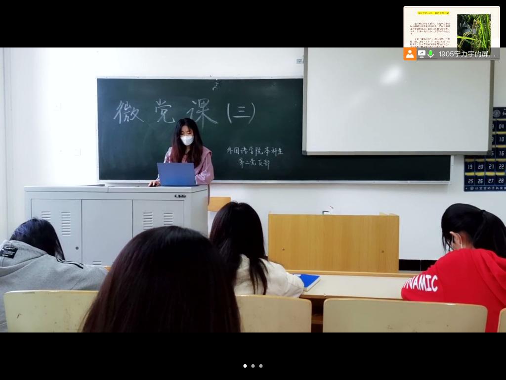 15vip太阳集团官网本科生第二党支部于4月22日下午通过线上线下相结合的方式举办双语微党课活动。参加本次微党课的有党员以及部分入党积极分子。此次微党课由预备党员宁力宇和韩佳泽主讲。