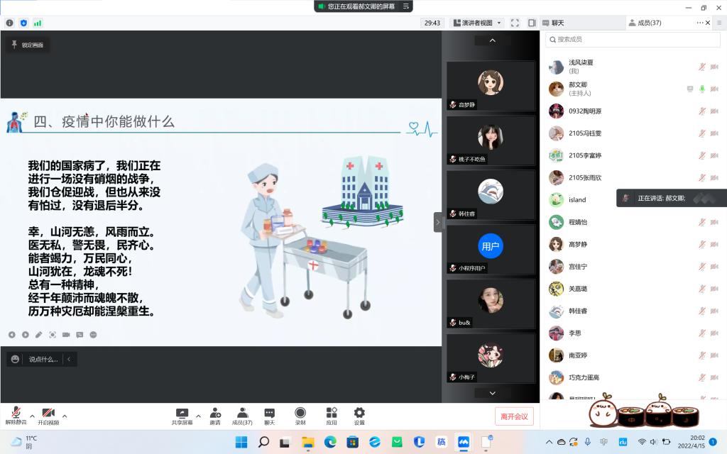 本次活动分为三个部分:新冠防控的知识宣讲、视频学习和防疫中的感动人物事迹分享。活动伊始,由郝文卿带领团支部成员学习新冠病毒知识。之后,进行了“新冠知识知多少”问答互动,加深了同学们对疫情防控相关知识的了解。接着,郝文卿带领同学们观看“新冠疫情的流行特点与防控原则”视频,在互相讨论后,大家积极发言,分享自己的观后感,坚定了同学们落实疫情防控要求的意念,加强了同学们疫情防范意识。最后,郝文卿与同学们连麦互动,讲述在疫情防控期间遇到的感动人物事迹,切实增强了疫情防控教育的感染力,提升了同学们的参与感与成就感。
