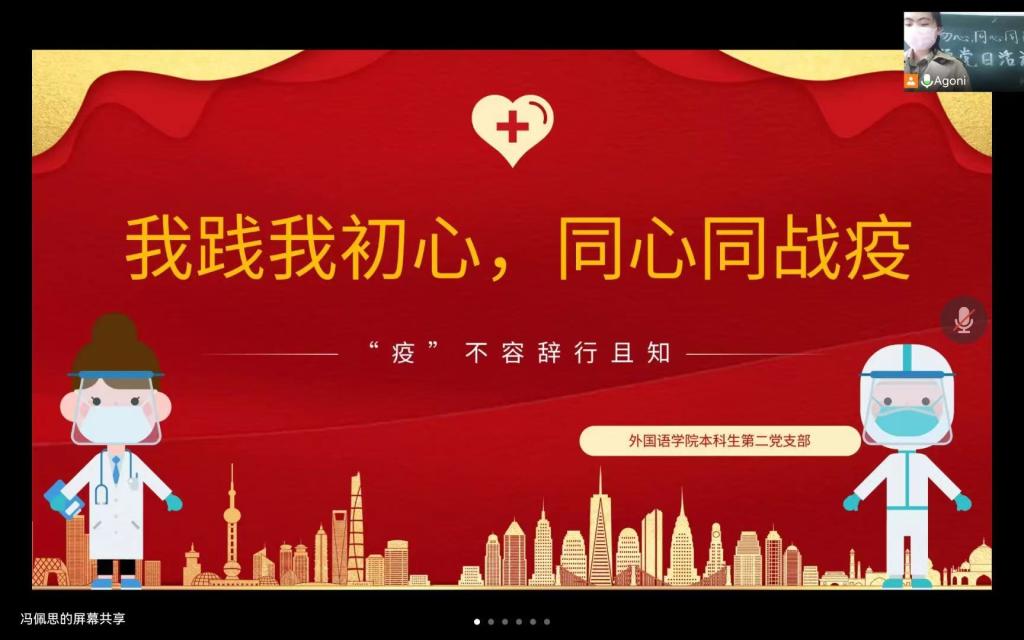 接下来,支部党员就抗疫工作和志愿经历进行交流。王雨婷和张颖分别在社区和实习学校做志愿者,既要负责信息录入,又要安抚居民和学生情绪。她们表示,虽然很累,但心里却很充实满足。赵潇叶谈到,因学校封控不能回家处理家事,情绪很差,但是想到自己是一名党员,有很多工作要完成,很快就进行自我调整,积极投入到志愿服务中,并由此感到无比光荣与骄傲。梁文丽说到,看到舍友在疫情防控期间积极参加志愿服务活动,帮助同学们排解焦虑情绪,她深受感染;经过申请,她本人也如愿在应急防控演练中报名成为了志愿者,和大家并肩作战。在家隔离的徐国鑫表示希望自己可以早日回归学校,同大家团结一致,共战疫情。