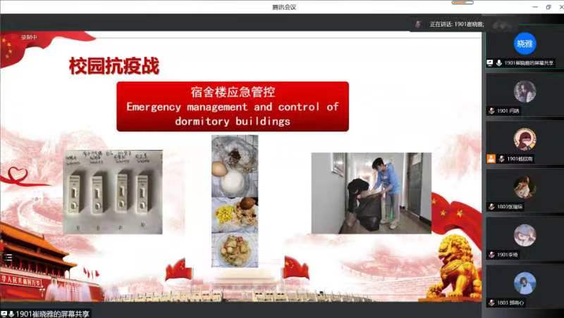 郭雨心同志先向大家介绍了山西省爱国拥军促进会退役军人应急救援总队、太原小店区退役军人志愿队和太原小店区军嫂巾帼志愿队三支队伍。接着,王晶和李琦两位同志分别讲述了倒在抗疫一线岗位的李钊同志和90后党员护士张盈同志抗疫的感人事迹。随后,崔晓雅讲述了我校的校园抗疫战,使同学们进一步认识到抗击疫情人人有责,需要每一个人付出自己的努力、做出自己的贡献。