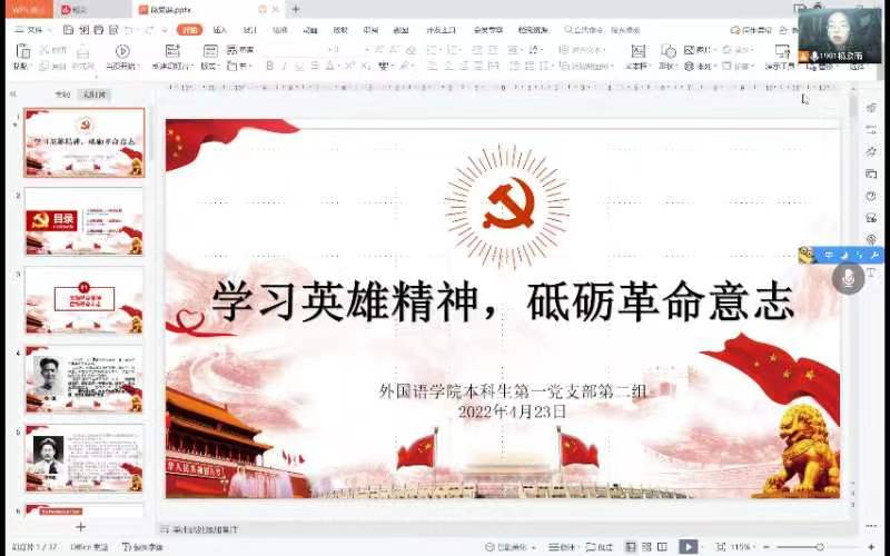 4月23日下午,15vip太阳集团官网本科生第一党支部在腾讯会议线上开展“学习英雄精神,砥砺革命意志”双语微党课活动。支部书记刘丽出席此次活动,参加活动的成员有部分预备党员,19级杨欣雨主持本次活动。