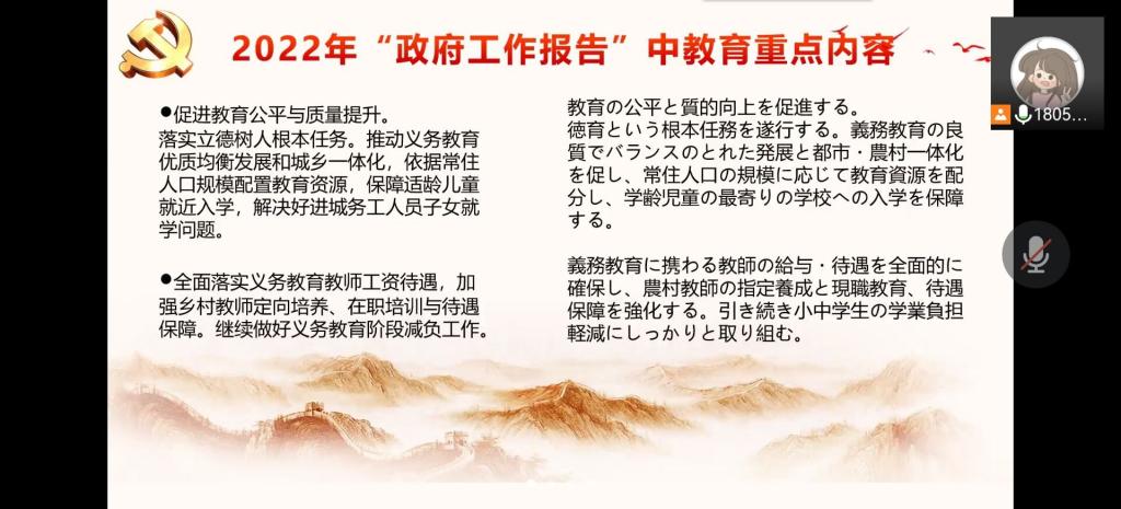梁文丽以“促进教育改革•构筑精神文明”为主题,向大家介绍了2022年政府工作报告与“十四五”时期关于教育的重点内容。通过学习,大家了解了党为基础教育、教育公平以及教育质量等方面做出的一系列举措。