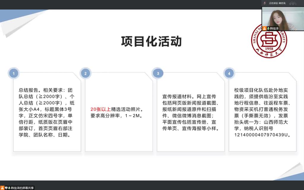 会上,韩佳泽从成员构成、常规活动、服务基地建设和特色志愿服务等方面向大家介绍了青协一年以来的工作情况,分享了工作经验。接着,韩佳泽为大家讲解了暑期“三下乡”社会实践活动的具体内容,包括项目化活动、自主实践调研、注意事项以及安全急救常识。在提问环节,同学们积极提出自己的疑问,青协工作人员为大家一一解答。