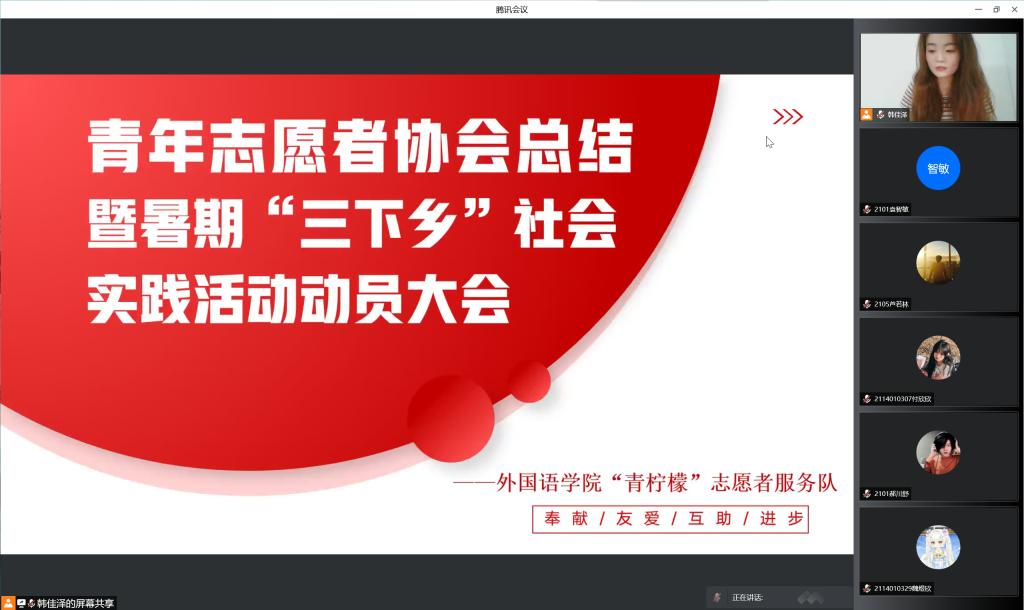 太阳官网于5月2日通过腾讯会议举办青年志愿者协会总结大会暨暑期“三下乡”社会实践活动动员大会。大一至大三学生、院团委黎超参加此次会议,会议由青协负责人韩佳泽主持。