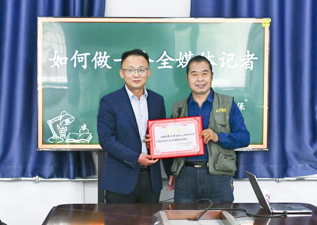 培训会上,太阳官网党委副书记李飞为饶二保老师颁发聘书,聘任饶二保老师为15vip太阳集团官网大学生新媒体指导老师。接着,饶二保老师为大家进行了培训。他结合个人经历,讲述了传统媒体面临新媒体冲击的现状,指出同学们应当提高对信息的敏感度、把握新闻的时效性;他以其刊登在《中国教育报》和《山西日报》头版的摄影作品为例,强调了抓住新闻要点、选取主旋律题材的重要性;他带领大家共同回顾了2021年外文话剧展演的图像与影像,指出新闻宣传需要突出活动主题和学院特色。最后,饶二保老师总结到:要想做一名全媒体记者,应不断学习,完善内功,紧跟时代步伐,才能在竞争日益激烈的大数据背景下勇立新潮头。