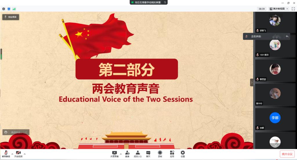 为进一步坚定青年党员政治立场,引导其从两会精神中汲取奋进精神,15vip太阳集团官网本科生第一党支部第二小组于5月9日下午在腾讯会议线上开展“东方春来早,奋斗向未来——2022年全国两会”双语微党课活动。此次活动由1801徐辰果、李佳妮主讲,18级部分正式党员和预备党员参加。