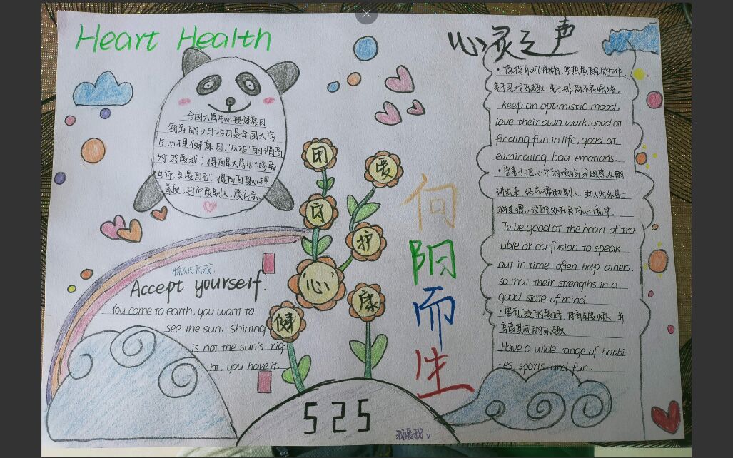 “同‘心’抗疫,共绘美好”手抄报征集活动要求同学们结合外语专业特色创作出关于抗击疫情,调节心理的手抄报作品。参赛同学紧扣主题,通过巧妙的构思、完整的构图、精彩的配文将自己对心理健康知识的独特见解描绘出来,传播着积极向上、自信阳光的生活态度。在绘制手抄报的过程中,同学们丰富了自己的课余生活、学习了心理健康的相关知识。