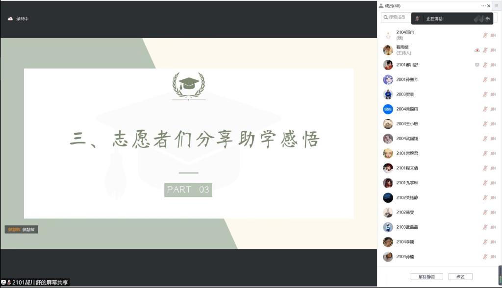助学过程中,助学志愿者们及时和学生家长沟通,了解助学对象具体学习情况,不断改进课堂教学内容。同时开展了英语趣味课堂及双语红色文化课堂,利用英文电影、歌曲和配音等丰富多彩的形式帮助同学们感受到了英语的独特魅力。最后,在结班仪式上,助学志愿者们一起分享了暑期教学成果以及家长对助学志愿者的评价与反馈。大家纷纷表示:他们在此次活动中积累了宝贵的教学经验,而且十分愿意加入到之后的助学活动之中。