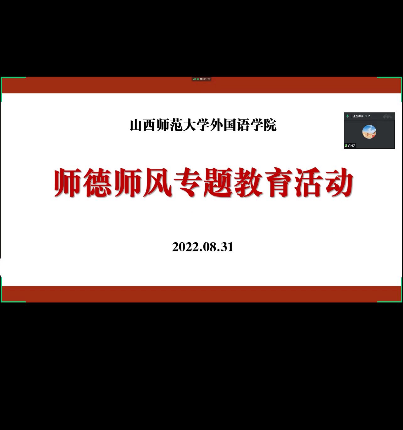 副院长关黑拽围绕师德师风专题,详细解读了《中共中央 国务院关于全面深化新时代教师队伍建设改革的意见》、《中共山西省委 山西省人民政府关于全面深化新时代教师队伍建设改革的实施意见》、《高等学校教师职业道德规范》、《新时代高校教师职业行为十项准则》、《教育部关于高校教师师德失范行为处理的指导意见》、《山西师范大学师德失范行为处理办法》,结合典型案例,教育引导广大教职工吸取教训,不断筑牢廉洁自律的思想防线。