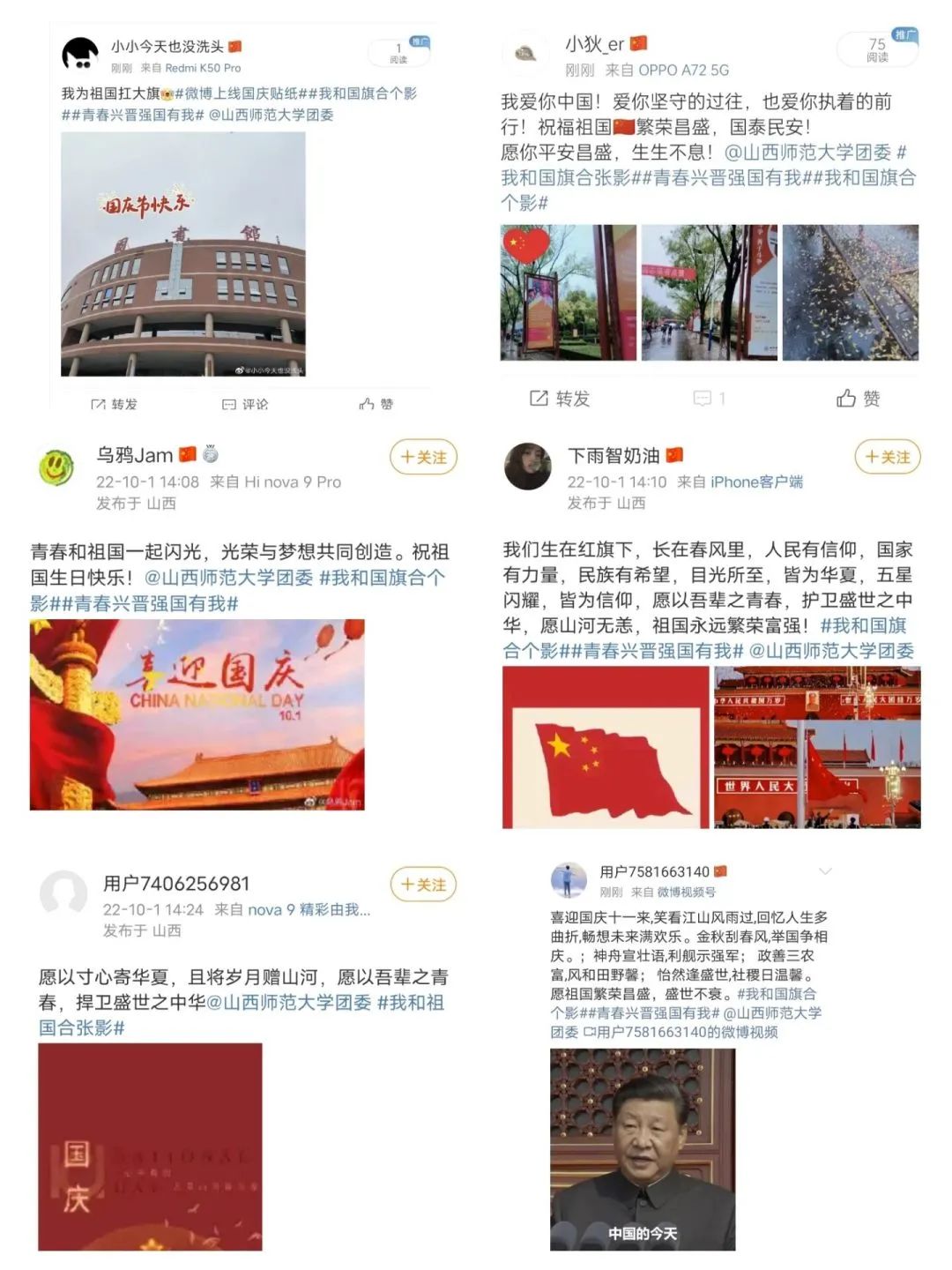 本次活动围绕“我与国旗合张影”、“我为祖国唱首歌”、“喜迎二十大,深情表白祖国”、“同上一堂传统文化思政大课”四个主题,以线上线下相结合的方式展开。“我与国旗合张影”活动中,同学们与国旗合影,以敬仰之心向祖国献礼,以赤诚之心愿祖国更好。同唱一首歌,祝福献祖国,“我为祖国唱首歌”活动中,同学们身着校服,挥舞国旗,在校园里唱响《我和我的祖国》,嘹亮的歌声表达了同学们对祖国的热爱与祝福。“喜迎二十大,深情表白祖国”,同学们在新浪微博平台以配图加挂话题的形式发表自己想对祖国说的话,真诚祝愿我们的祖国山河无恙,繁荣昌盛!在活动期间,各班组织观看了线上“传统文化思政课”,深刻学习领会中华优秀传统文化精粹,争当中华优秀传统文化传承人。