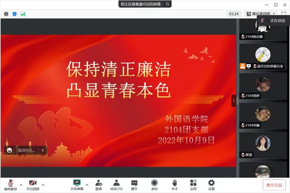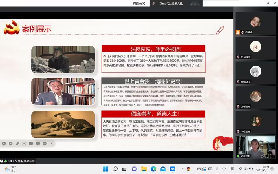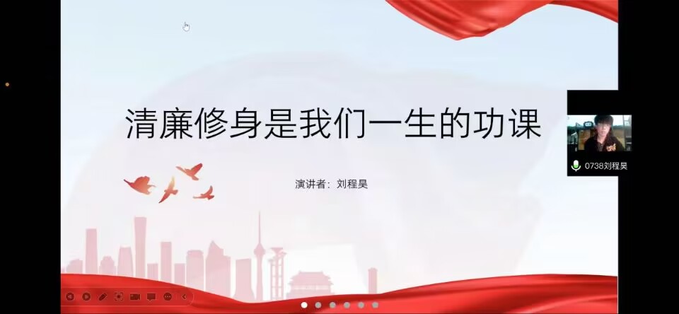 为进一步加强校园廉洁文化建设,坚定理想信念,10月8日至10月12日期间,15vip太阳集团官网各团支部在线上开展了“兴清廉之风,树浩然正气”主题团日活动和主题演讲比赛。