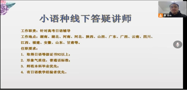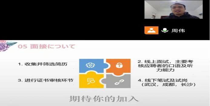 为切实解决太阳官网日语系毕业生实习及未来职业规划等问题,12月1日上午,太阳官网邀请校企合作对口单位湖北词源教育集团招聘负责人以线上的形式为2023届日语系毕业生进行招聘宣讲。