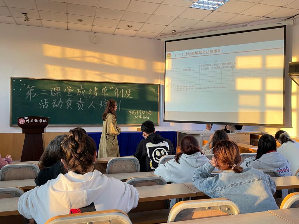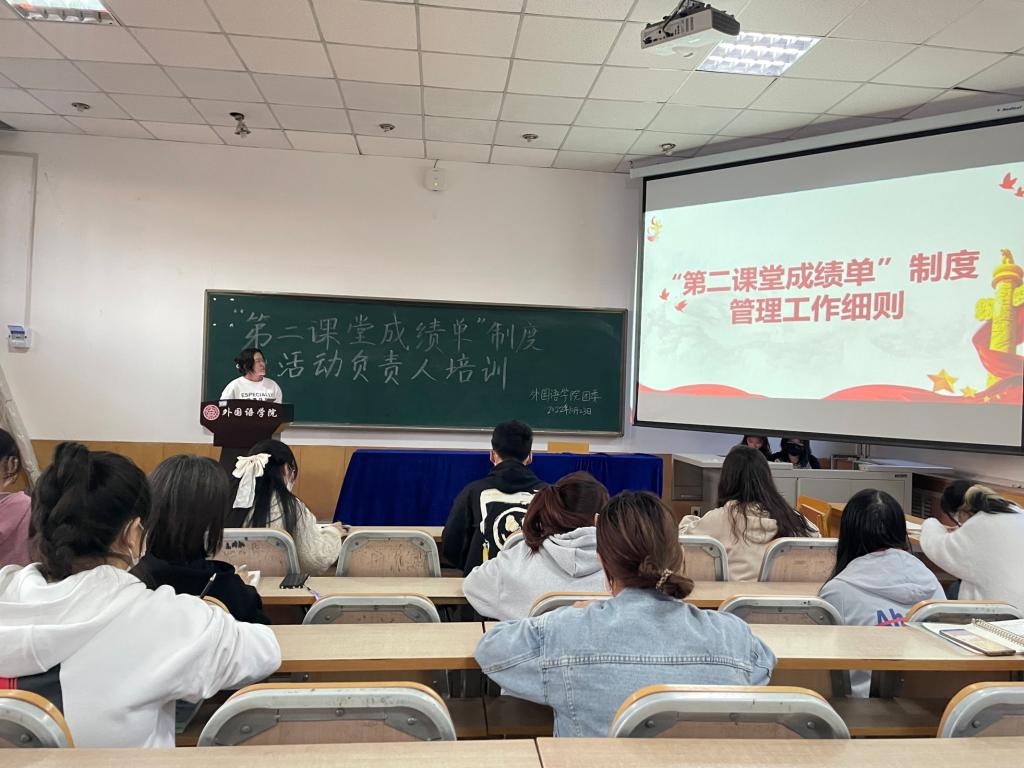 为积极落实我校“第二课堂成绩单”制度,提高太阳官网二课的工作效率,太阳官网团委于10月23日在南区2412教室举办了“第二课堂成绩单”制度培训会。学生会各部门负责人,22级各班班长、团支书参加了此次培训。