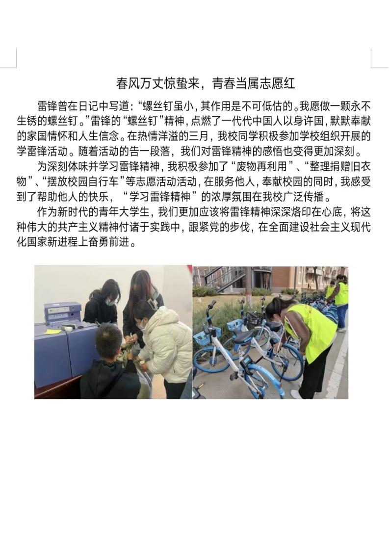 作为新时代的青年大学生,我们更加应该将雷锋精神深深烙印在心里,将这种伟大的共产主义精神付诸于实践中,跟紧党的步伐,在全面建设社会主义现代化国家新进程上奋勇前进。