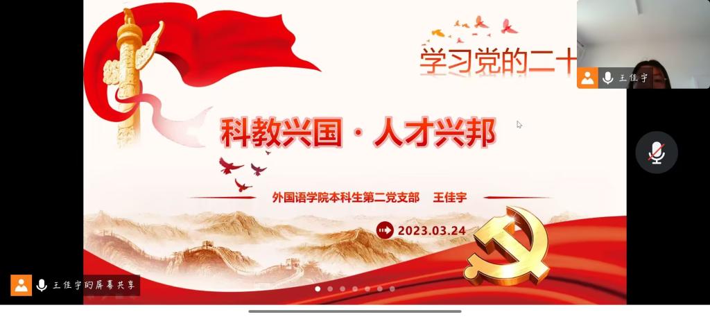 王青青同学以“全面学习党的二十大精神”为主题,讲解了学习贯彻党的二十大精神,要在全面把握上下功夫,号召当代青年应该将其精神内化于心,外化于行。王佳宇同学以“科教兴国 人才兴邦”为主题,重点介绍了“科技是第一生产力、人才是第一资源、创新是第一动力”,指出大家要尊重知识,树立终身学习的理念,不断增强本领。