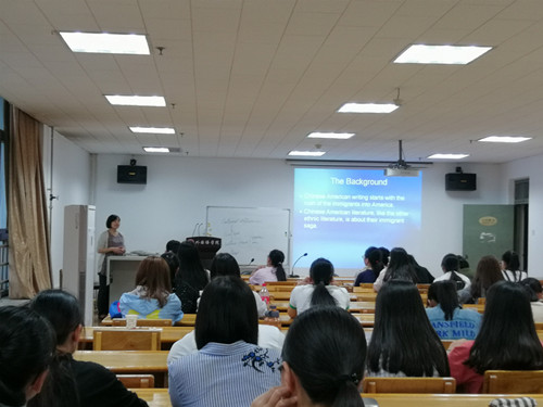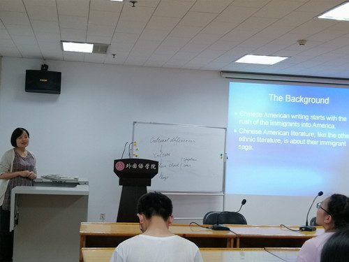 接下来田老师介绍了美国华裔文学的大背景,19世纪中期大批中国人随着淘金热移民到美国,大部分中国人在当时都充当着苦力,他们没有多余的时间去学习英语,语言不通工作繁重的他们没有时间和精力去叙写文学作品,这个时候他们往往是白人笔下的represented objects, 田老师将被描写的中国人分为了两大类,男性和女性。老师为我们生动地讲解了Ah sin、FuManchu等男性代表人物,其中有的滑稽不堪,此时文学中还并没有带着歧视色彩;有的代表着罪恶,他们充当杀手,经常神奇地刺杀白人,这种文学作品中其实已经歪曲了中国人的形象。接下来老师讲述了女性代表人物,她们往往分为两种,一种是会功夫的邪恶角色,另一种是性格温婉恬静、身材匀称的东方女性角色。