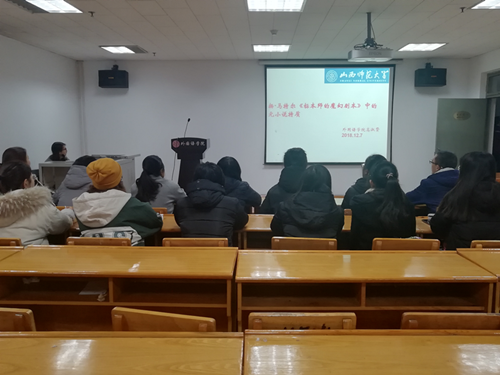 2018年12月7日晚,15vip太阳集团官网邀请高淑贤老师在11722会议室进行了学术讲座,高淑贤老师以“《标本师的魔幻剧本》的元小说特征”为题,为大家带来了一场非常精彩的视听知识盛宴。太阳官网大一、大二英美文学方向的部分学生聆听了此次讲座。