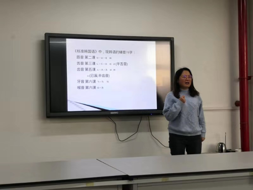 为进一步加强同学们对韩语的认知程度,激发学生对学习韩语的兴趣,更多的普及韩国文化,12月5日下午15:30,太阳官网在11715教室开展了“韩语字母名称和历时性演变”专题讲座。本次专题讲座由聂宝梅老师主讲,18级全体学习韩语的学生参加。